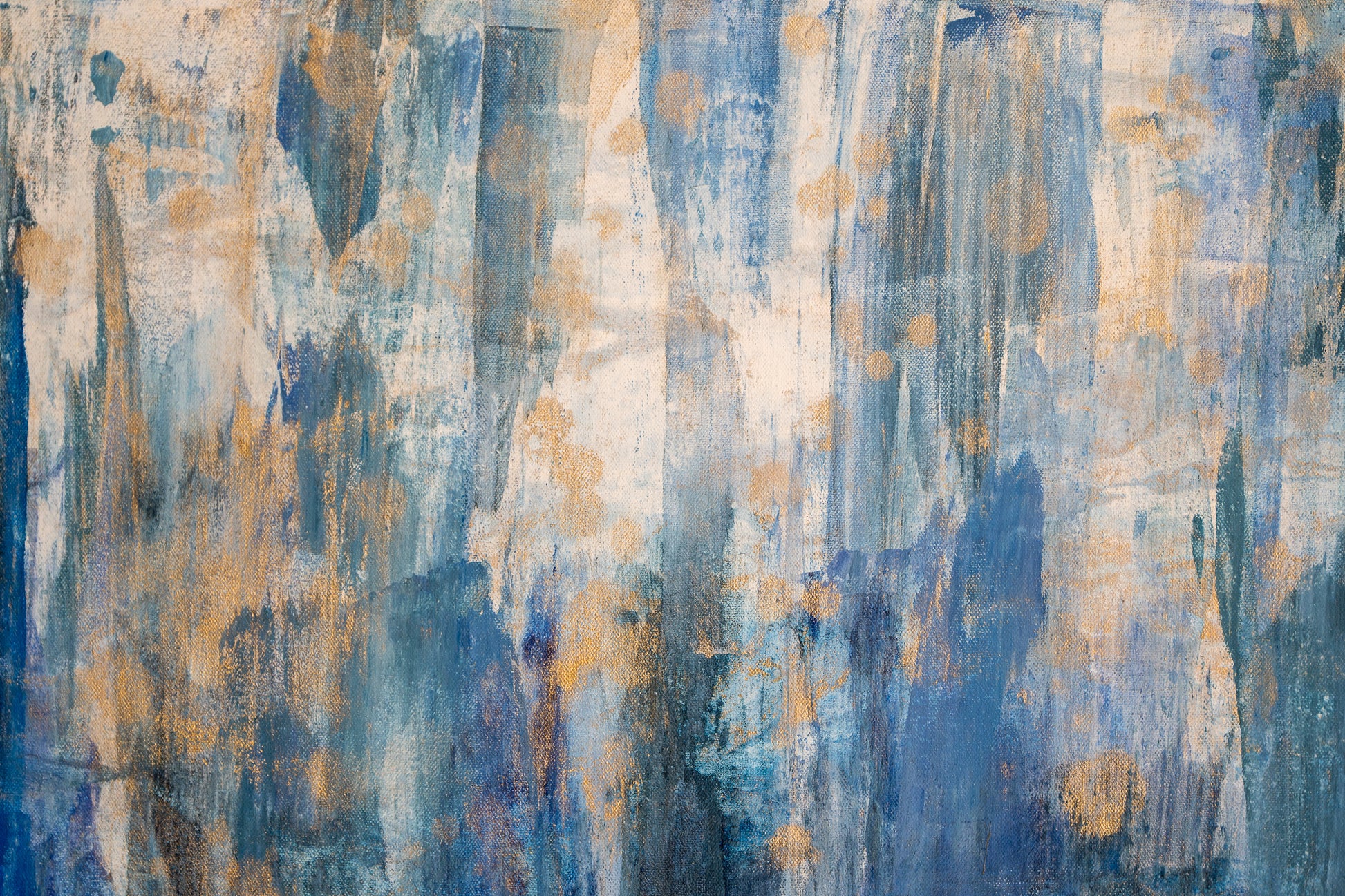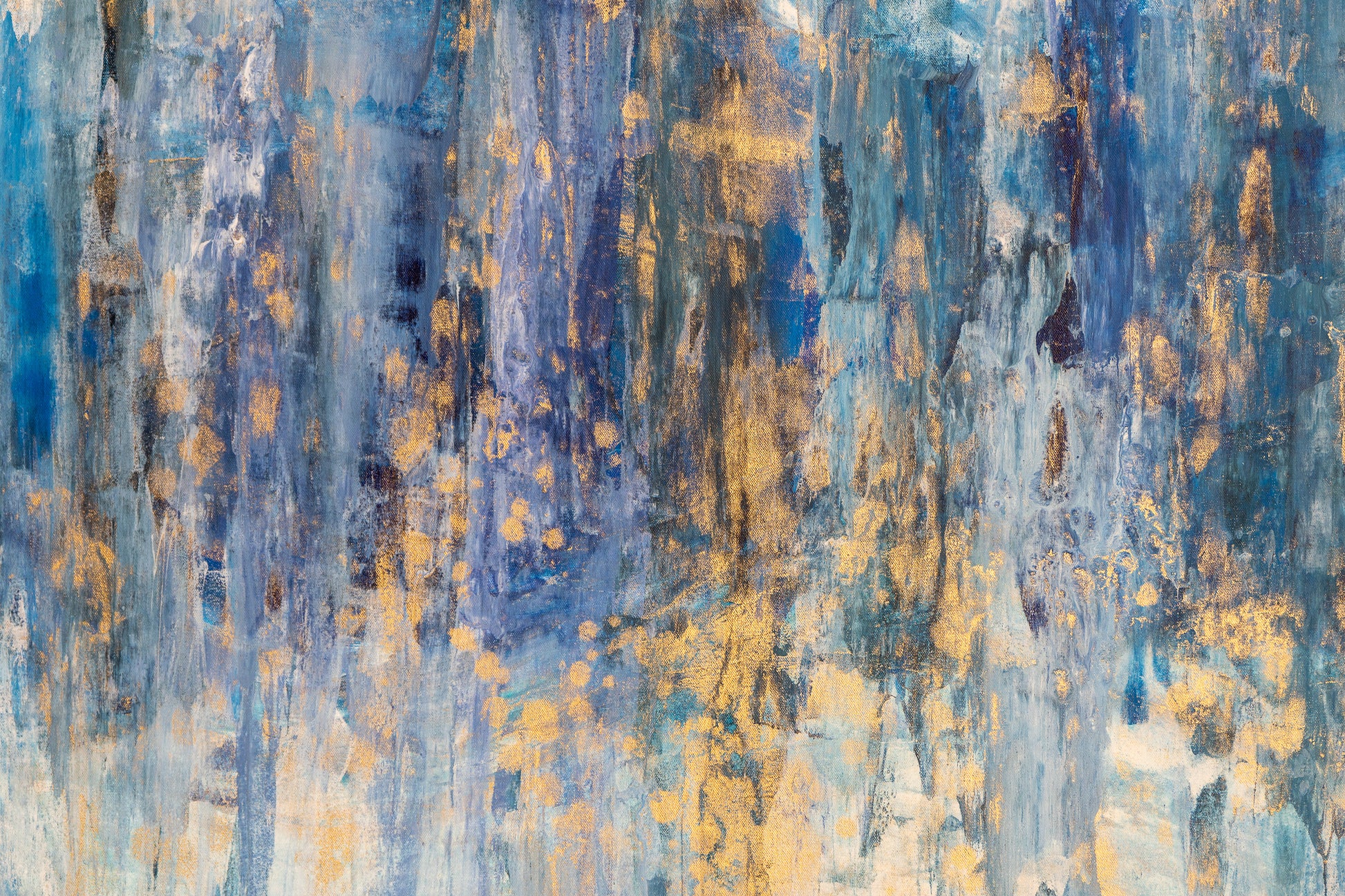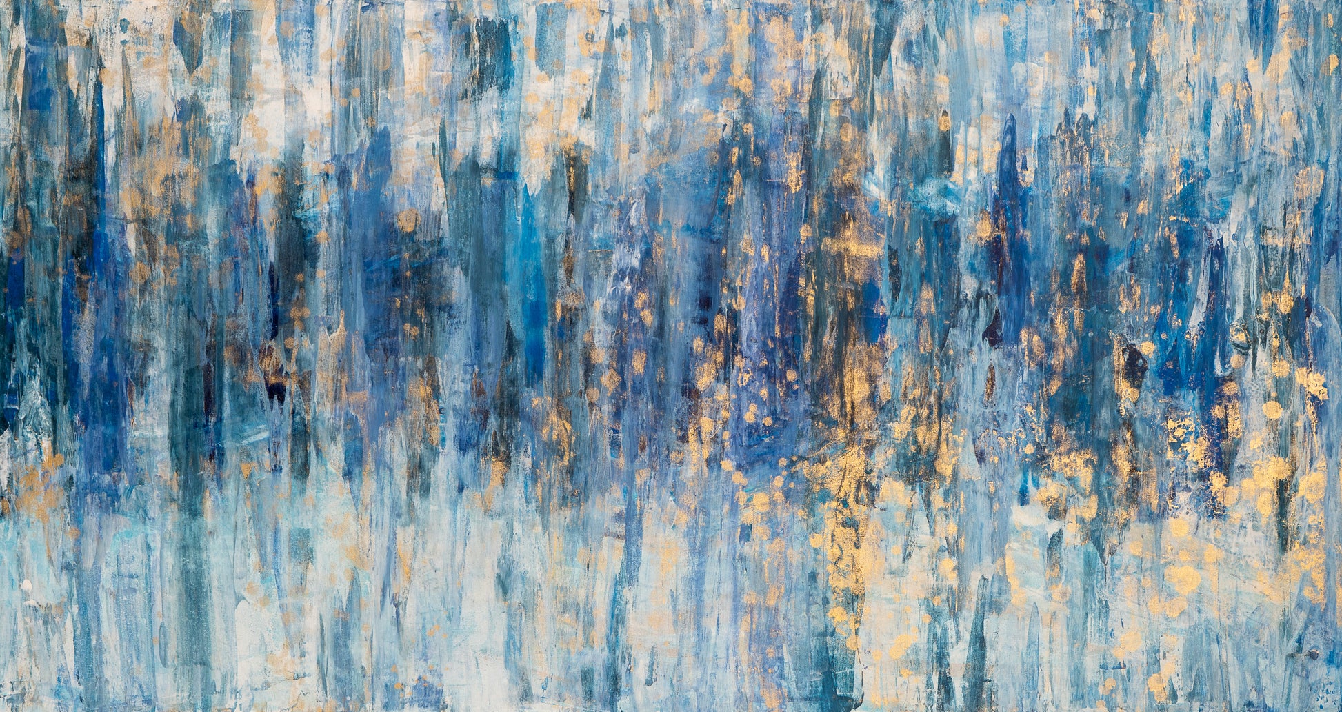 “Glacial Echoes” is a commanding abstract painting measuring 66.5 x 36 inches, created to leave a powerful impression. Vertical layers of icy blues, deep indigo, and soft turquoise cascade across the canvas, evoking the strength and stillness of glacial walls. Golden accents break through the cooler tones, shimmering like sunlight on ice and adding warmth and depth to the composition.