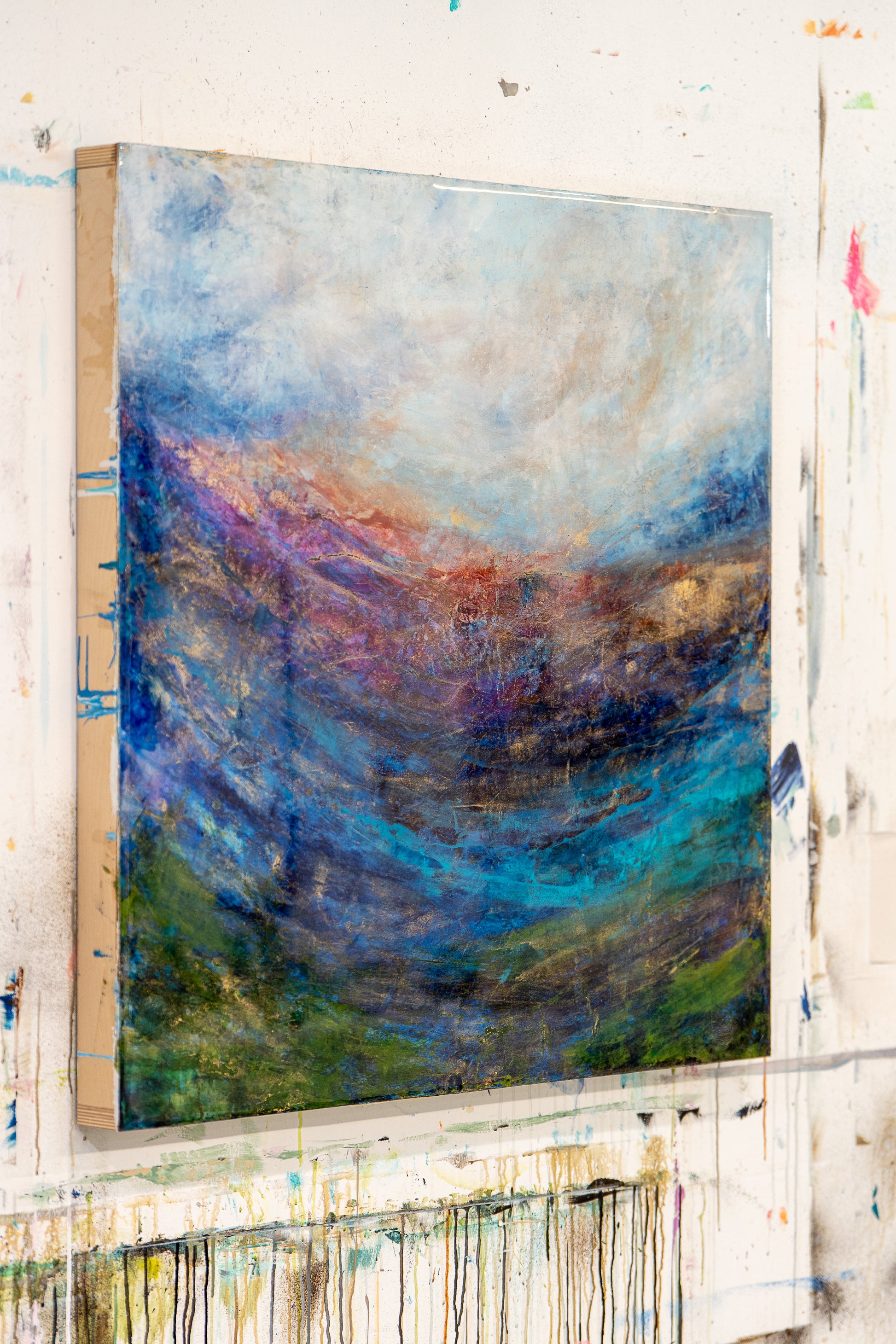 “Horizons in Motion” is an abstract landscape painting with flowing layers of blue, purple, green, and gold. The luminous textures and sunset tones create a sense of movement and depth, making it a striking statement piece for modern homes, offices, or gallery spaces.