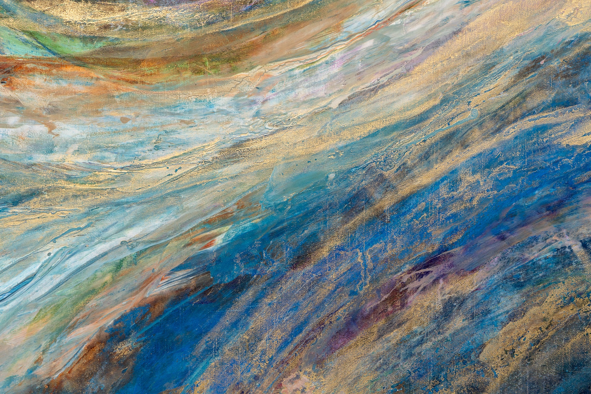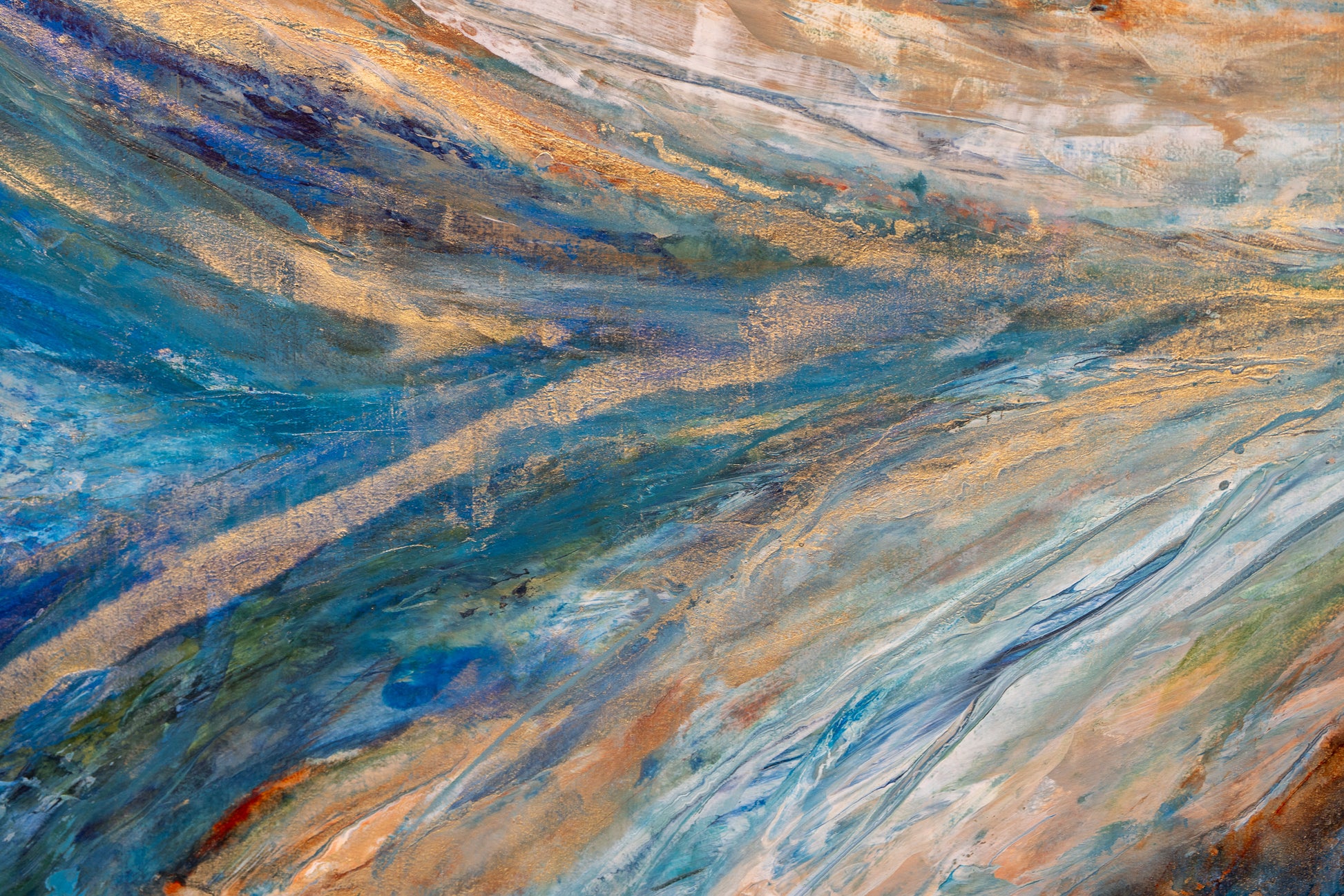 “River of Light” is a 48 x 36 inch acrylic on wood panel with resin, a dynamic abstract artwork that captures the flowing energy of water and the shimmer of reflected light. Bold strokes of blue, turquoise, and earthy bronze sweep across the surface, interwoven with radiant touches of gold that glimmer beneath the resin’s glossy finish. The movement within the composition evokes the carving of a river through stone, guiding the viewer’s eye upward into a luminous, open sky.